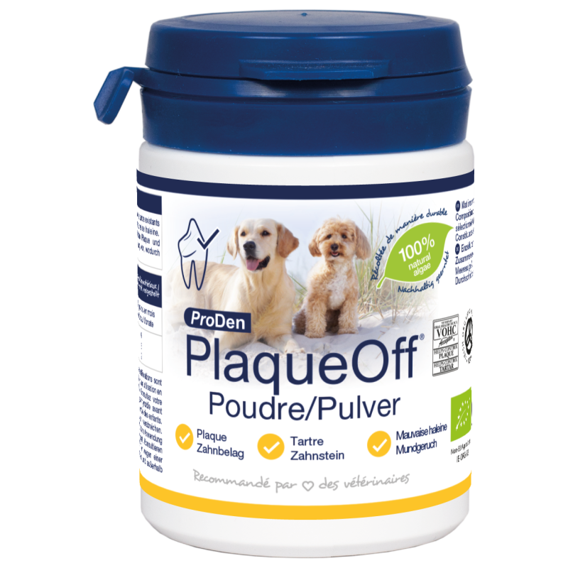 PlaqueOff se présente sous forme de poudre afin que vous puissiez offrir une hygiène bucco-dentaire impeccable à vos animaux facilement. En effet, PlaqueOff réduit la plaque dentaire, diminue la formation du tartre et combat la mauvaise haleine. Tous les ingrédients sont Bio.